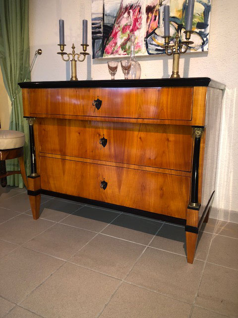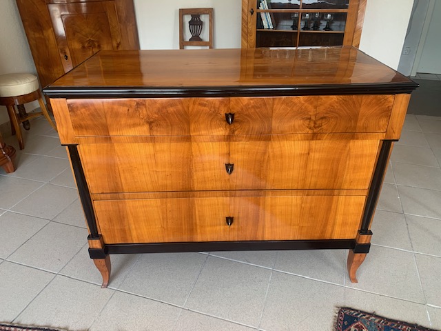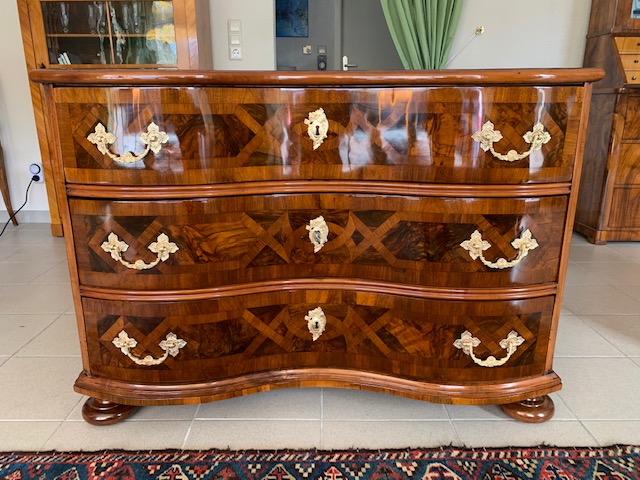 Louis Seize Kommode, Nussbaum furniert, wohl von Hopfengärtner, Schweiz um 1780, original Beschläge, feine Einlegarbeiten, Mäandermusterung, sehr schönes gespiegeltes Furnierbild, Restauriert und Schellack handpoliert