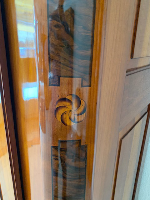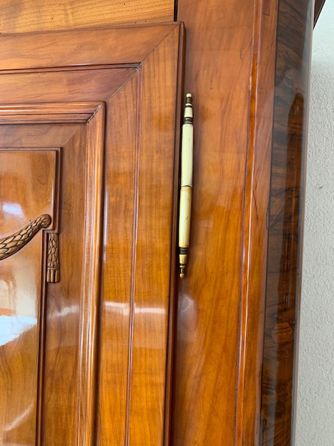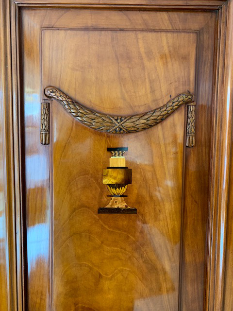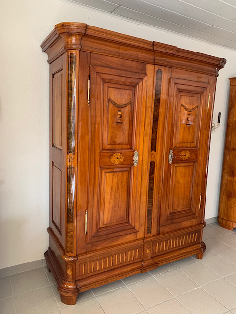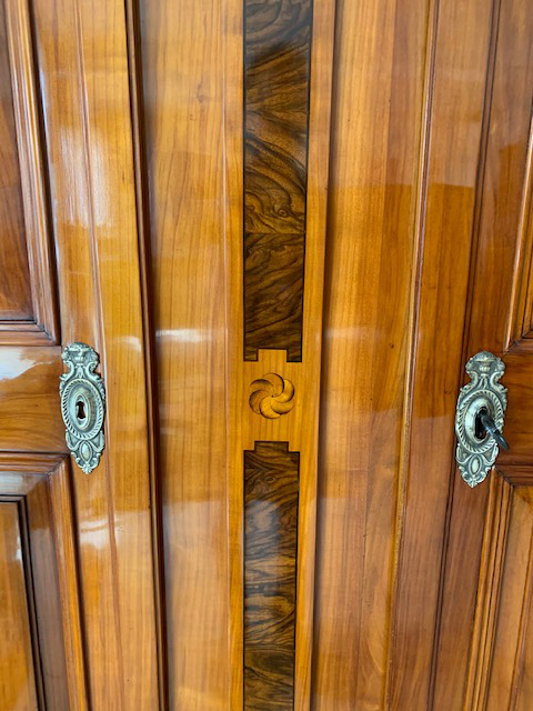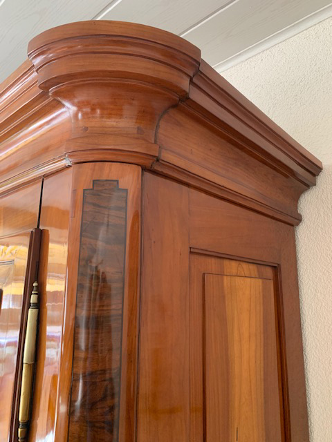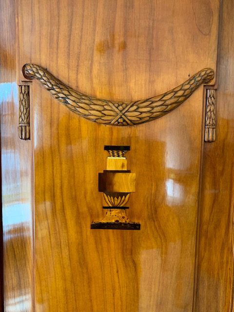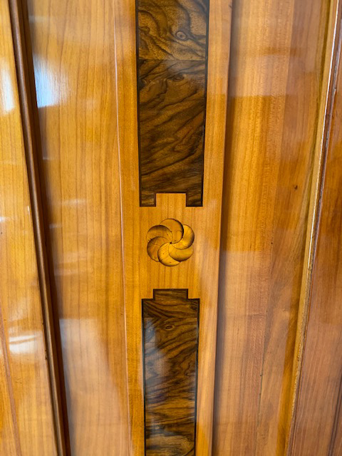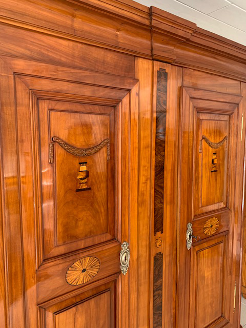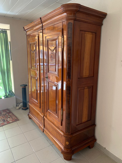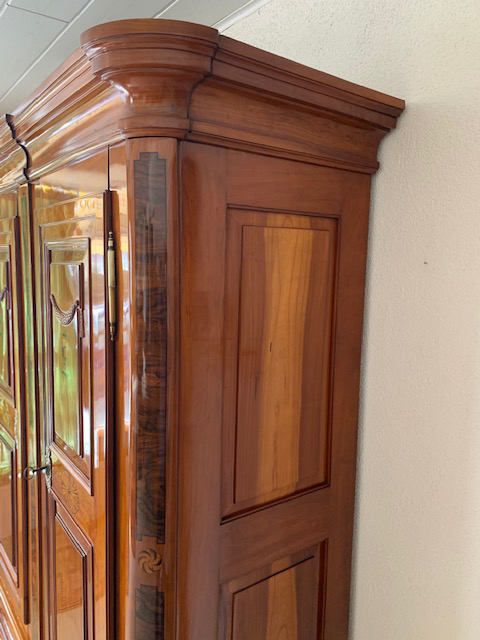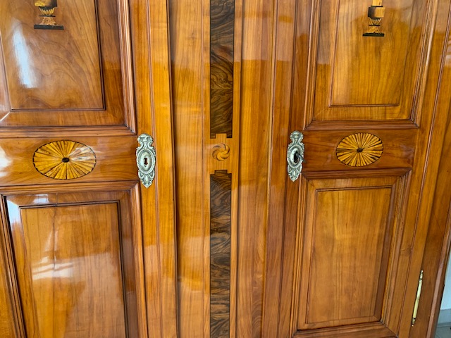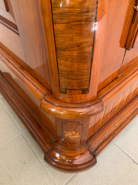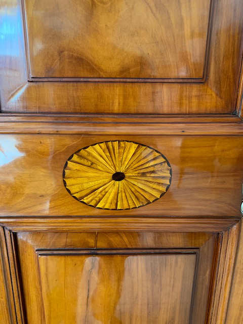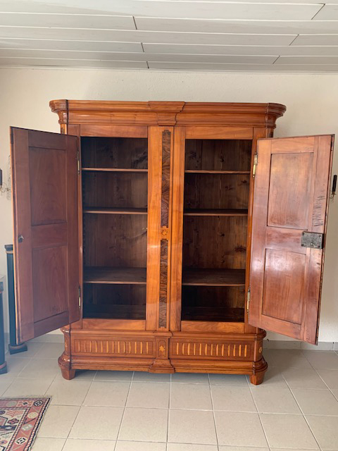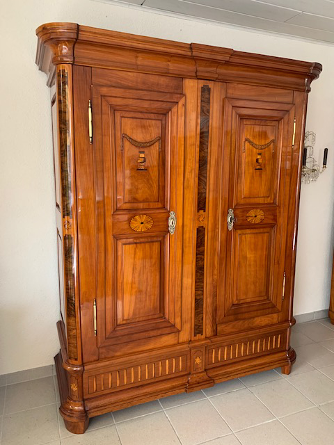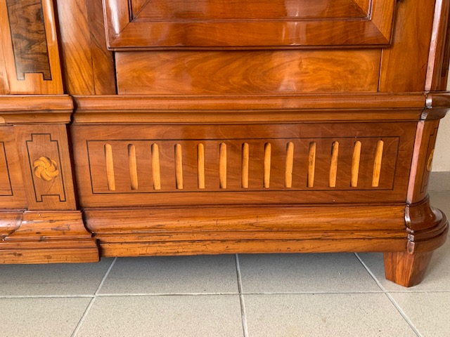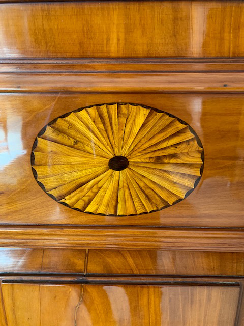 Kirschbaum massiv, hochwertig gearbeitet, reich mit diversen Edelhölzer eingelegt,