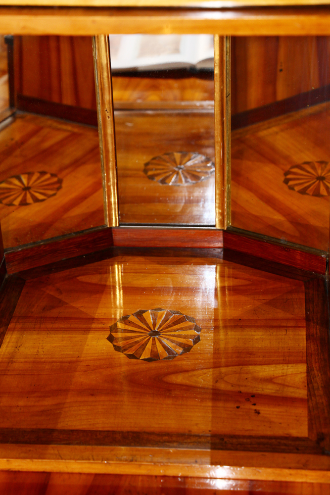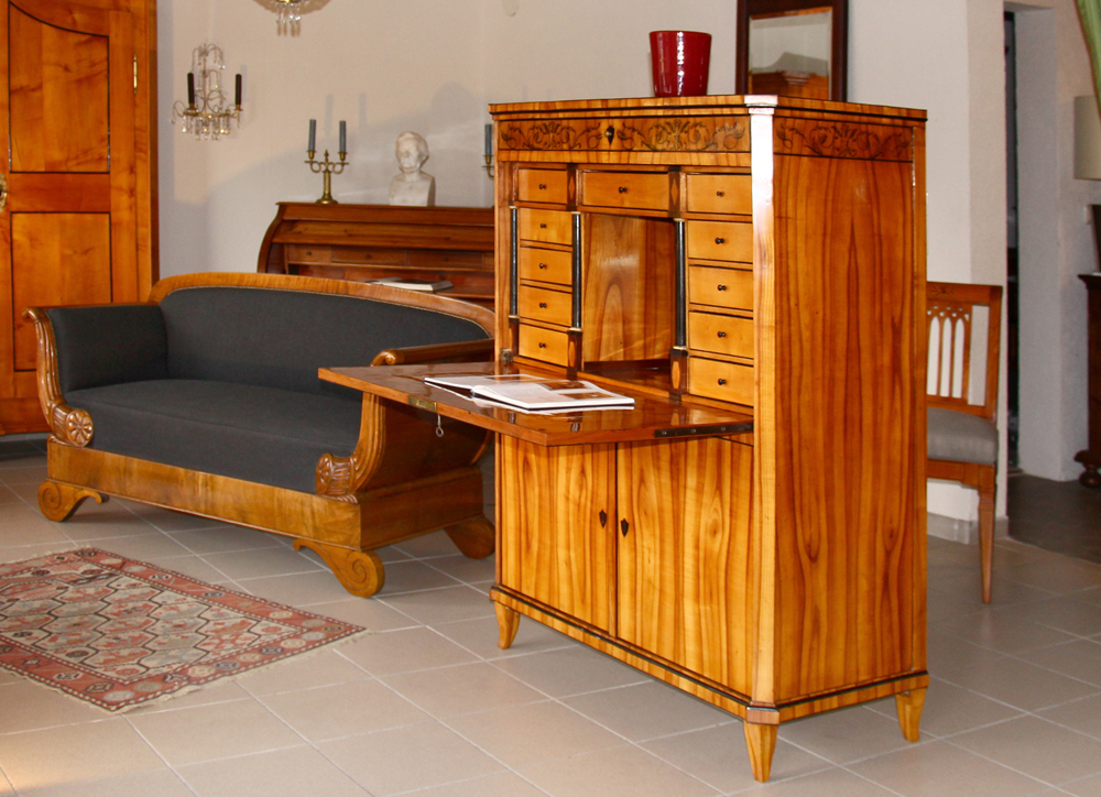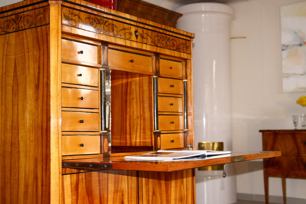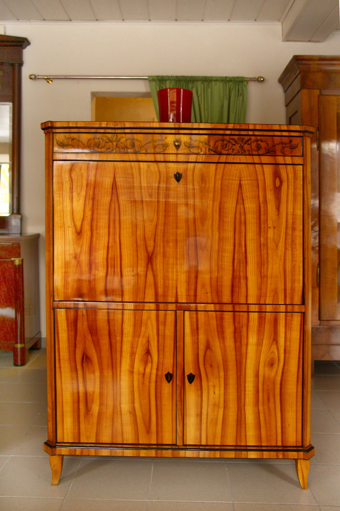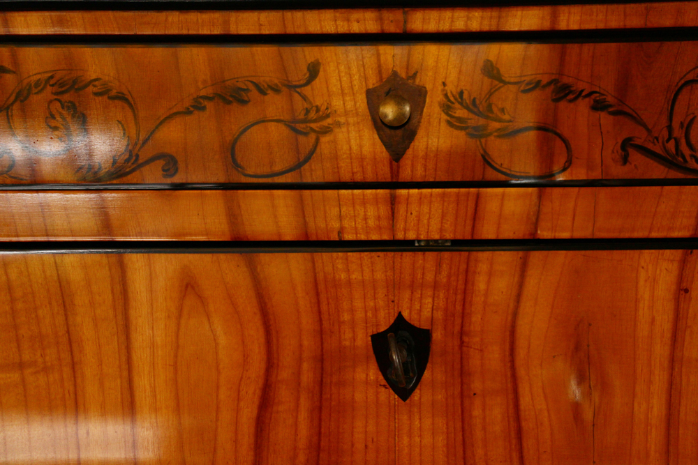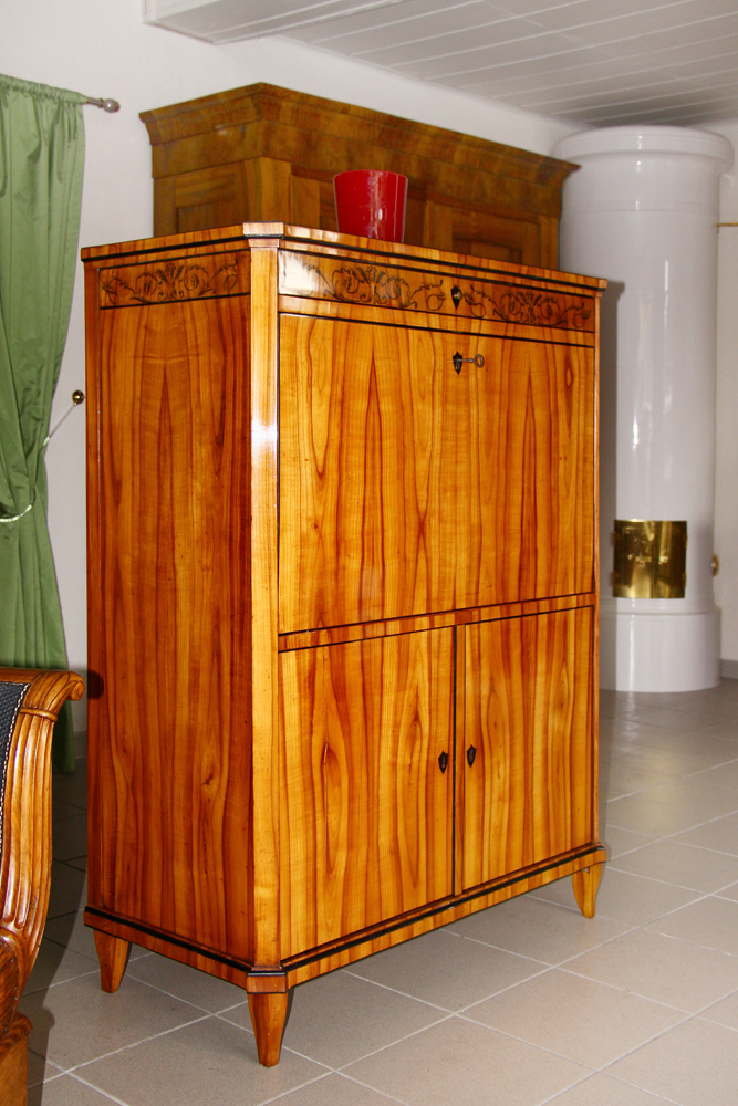 Kirschbaum furniert, mit Hersteller-Logo aus Papier (innenseitig angebracht) und Tuschmalerei, ehemaliger Adelsbesitz, München